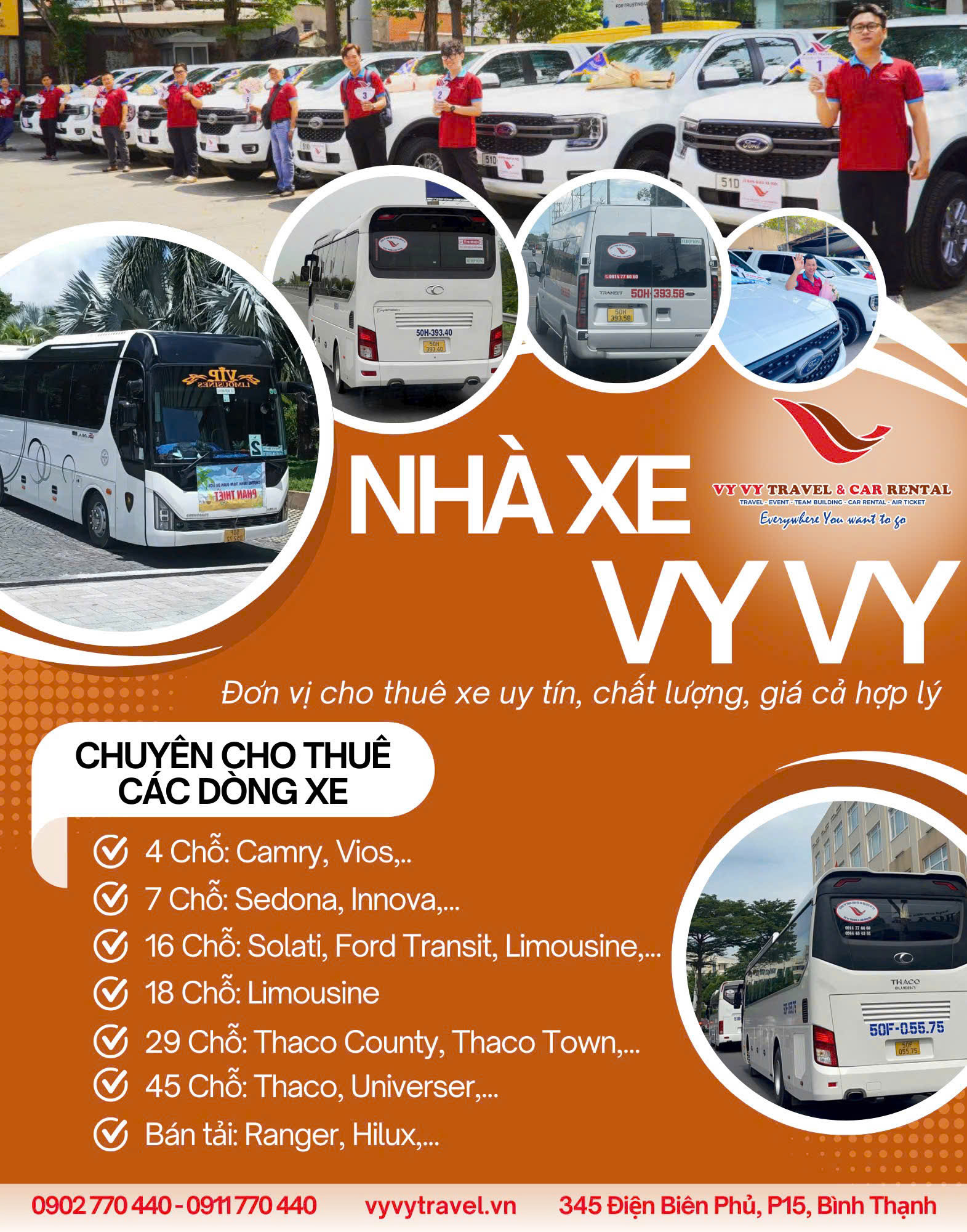 Vy Vy Car Rental tự hào là đơn vị cho thuê xe uy tín - chất lượng - giá cả hợp lý trên thị trường. Chúng tôi có đủ các dòng xe từ tầm trung đến cao cấp từ 4 chỗ - 45 chỗ, xe bán tải đáp ứng đủ các yêu cầu của khách hàng