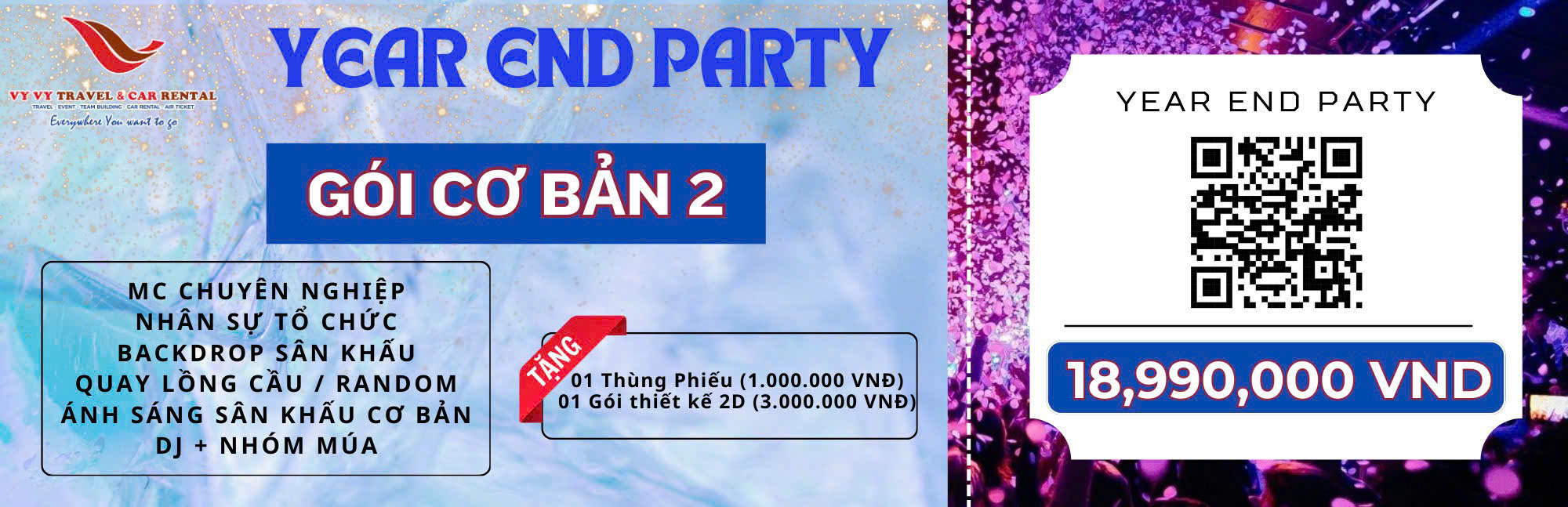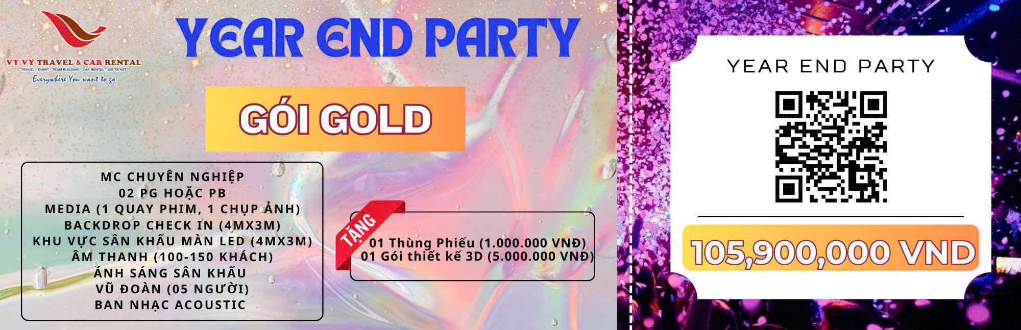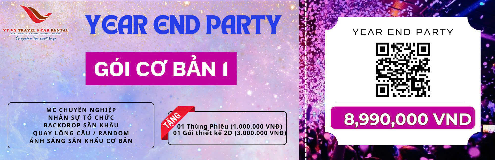 Hãy cùng Vy Vy Travel tạo nên những khoảnh khắc khó quên tại buổi tiệc hoành tráng cuối năm nơi mọi niềm vui hội tụ, mọi thành công được tôn vinh và mọi giấc mơ cho năm mới được thắp sáng!